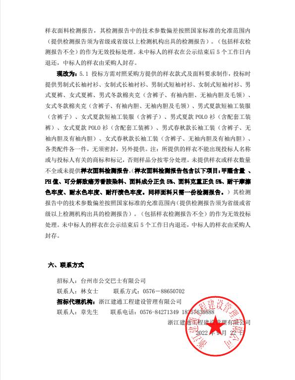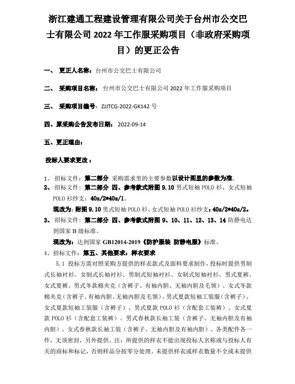 臺州市公交巴士有限公司2022年工作服采購項目更正公告