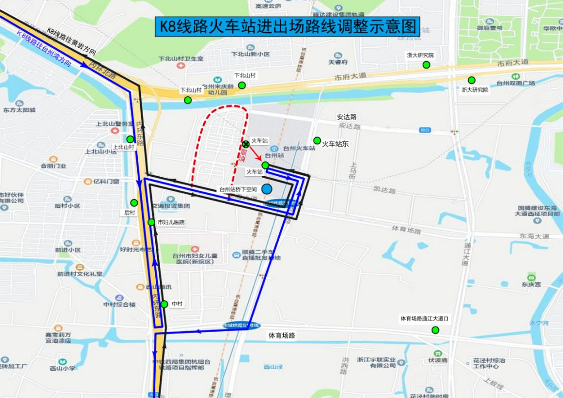 調整由體育場路、璟湖路進入臺州火車站公交樞紐站新場站。