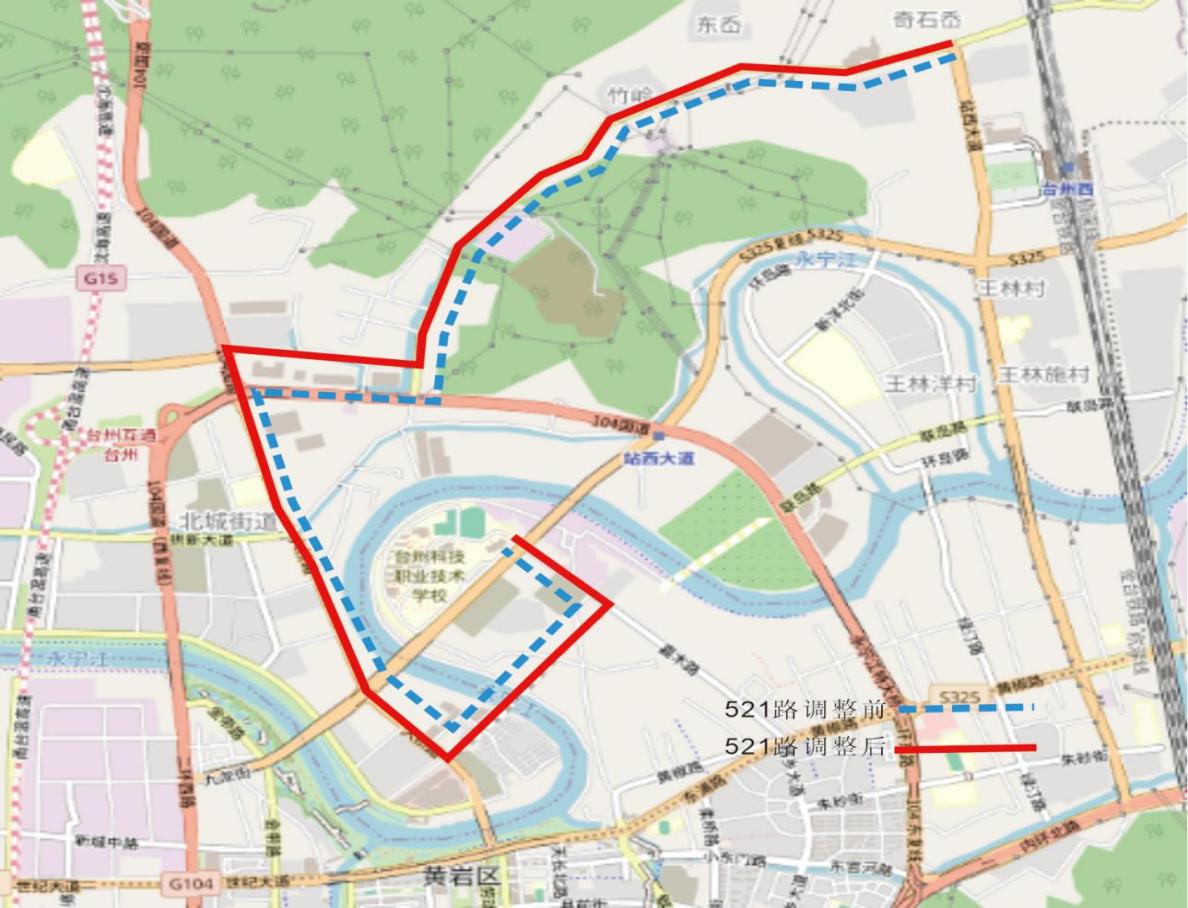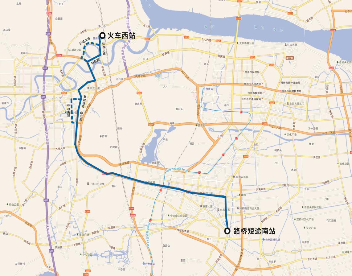 路橋短途南站-泰隆街-路橋大道(東)-路橋大道(西)-大環線-印山路-環城東路-東浦路-黃椒路-二環東路-聯島路-站西大道-火車西站。(不再經過勞動南路、站前大道)
