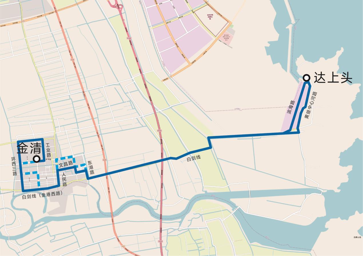 環西一路-金清大道-工業路-中心大道-環西三路-金港西路(白劍線)-人民路-文昌西路-文昌東路-糧庫路-花園新村內部路-東湖路-白劍線-海濱路-黃瑯中心河路。