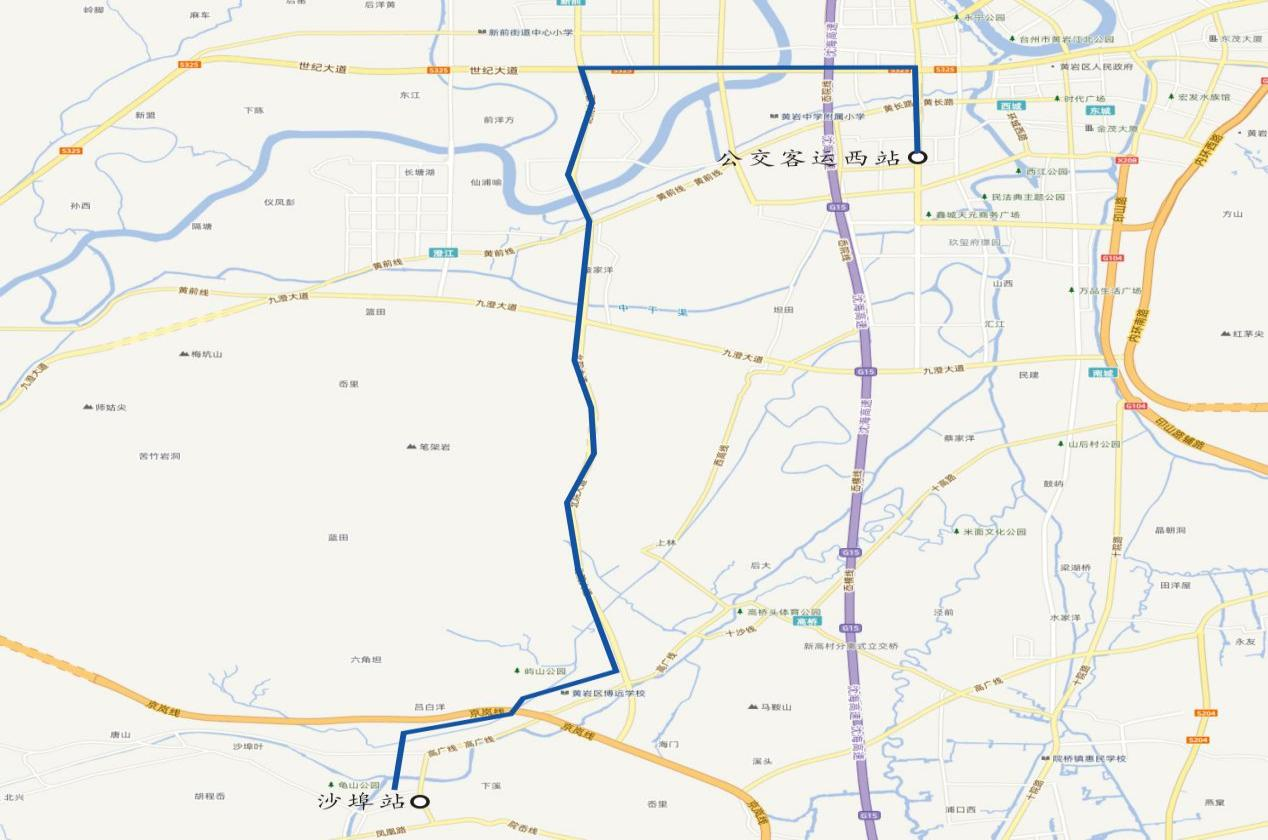 上行:沙埠車站、宏廣公司、瓦瓷窯、三童岙村岙口、三童岙村岙里、涼棚嶺村西、澄東村、寧江明月翠屏苑、寧江明月錦溪苑、寧江明月、城新廣場、黃巖區中醫院、梅園新村、公交客運西站