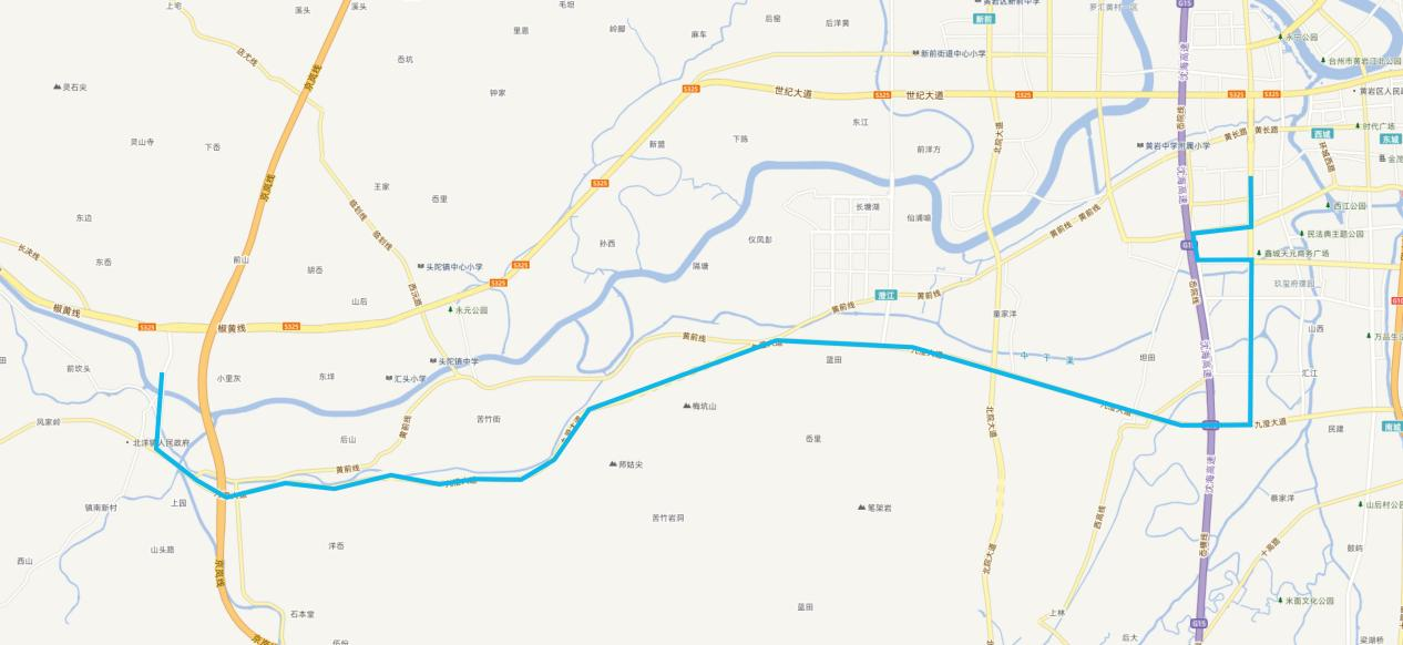 公交上垟站、上垟鄉政府、莆田、黃巖西洋、后呈、象岙、嶺腳、大巖、毛岙岸、雙橋、桐外岙、東溪、長潭、前蔣、謳韶、移建、北洋、小里橋、小里橋東(單向)、小里橋、公交北洋站。