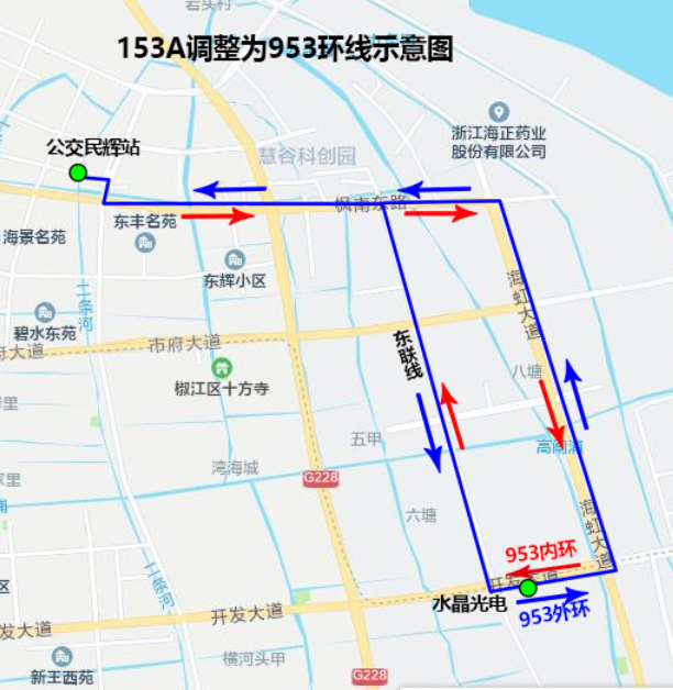 外環:公交民輝站、東豐路口、東豐村部、三條橋頭、臺州人才城、宏達輕紡、強鷹集團、華僑農業園區、東聯線東海大道口、三甲建設村、三甲建設村部、水晶光電、海虹大道東海大道口、義烏創業園、楓南東路海虹大道口、臺州人才城、三條橋頭、東豐村部、東豐路口、公交民輝站。