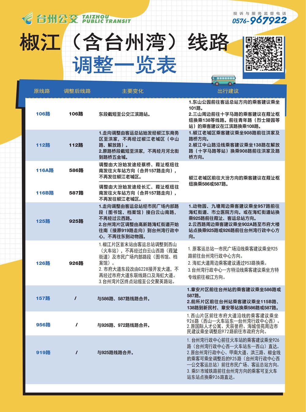 替代出行建議:臺州灣行政中心前往火車站的乘客建議乘坐926路(臺州灣行政中心西—火車站東—西山)直達。原臺州灣行政中心、甲南大道、洪三路、椒金線的乘客可乘坐調整后的925路(臺州灣行政中心西—公交客運總站)前往市民廣場、客運總站方向。