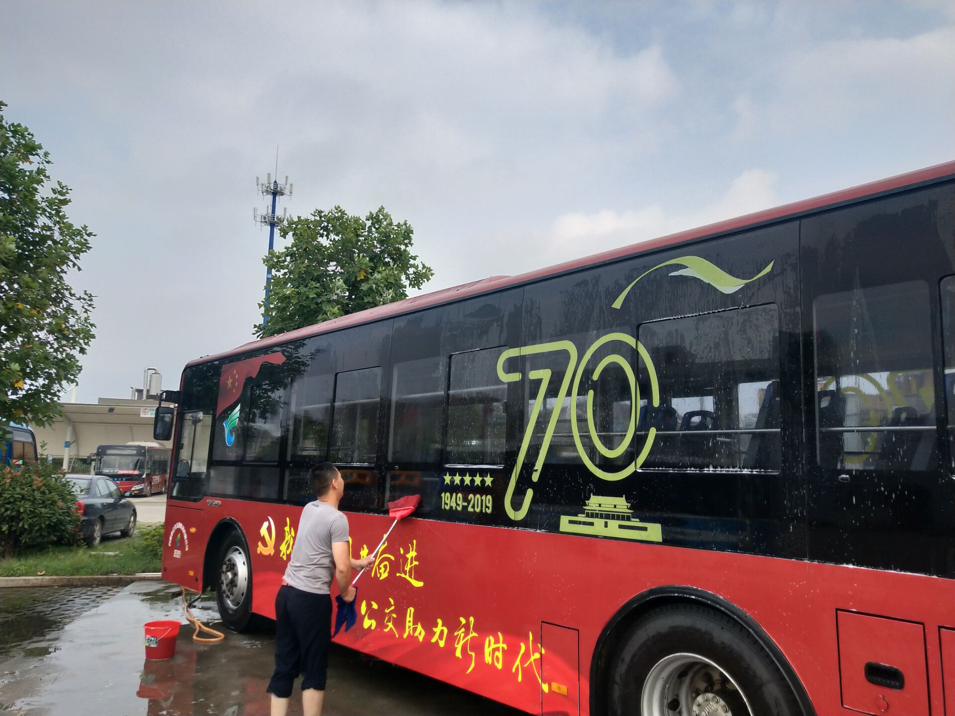 由于車身印有鮮艷的紅旗、70周年標志及“我與祖國共奮進,公交助力新時代”宣傳語,車輛無法用洗車機自動清洗。7月22日,駕駛員陳仙根早早來到車隊,拿著毛巾手動清洗,車廂內外的每一個角落,陳師傅都仔仔細細地一點點擦拭。陳師傅說:“車輛干凈整潔是為了讓拍攝效果更好,公司將這個光榮的任務交給我,是對我信任,再苦再累都不怕。2009年回到臺州,我就進入了公交行業,親身經歷了臺州公交從三區‘分治’到市區一體化,從大通道柴油車到新能源車輛,從人工售票到移動支付,這些天翻地覆的變化,讓我更深刻地感覺到祖國越來越強大?!?/span>